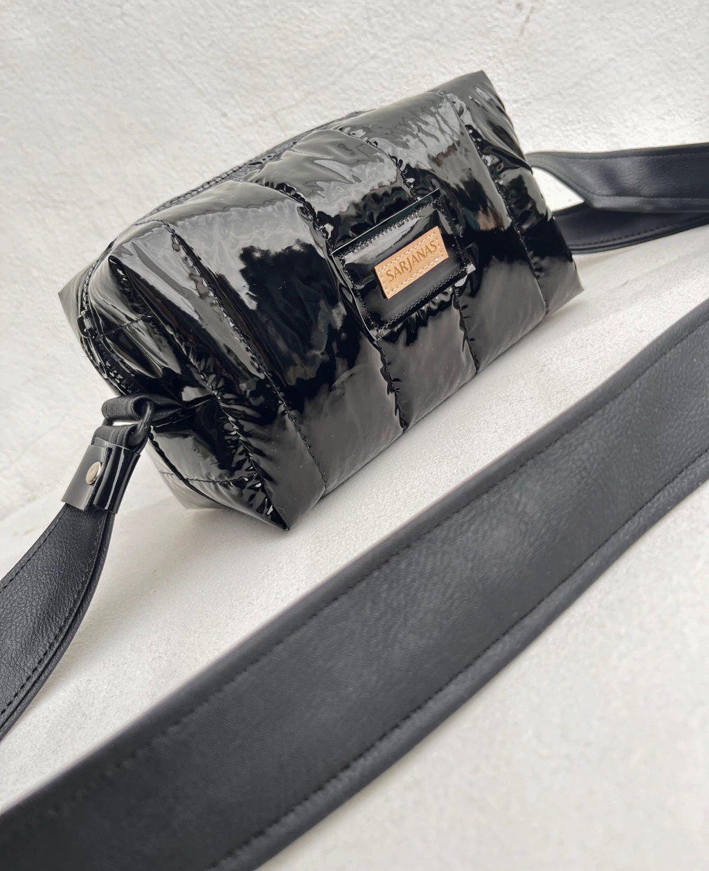 • Materiales: eco cuero negro + puffer negro brilloso + herrajes negros