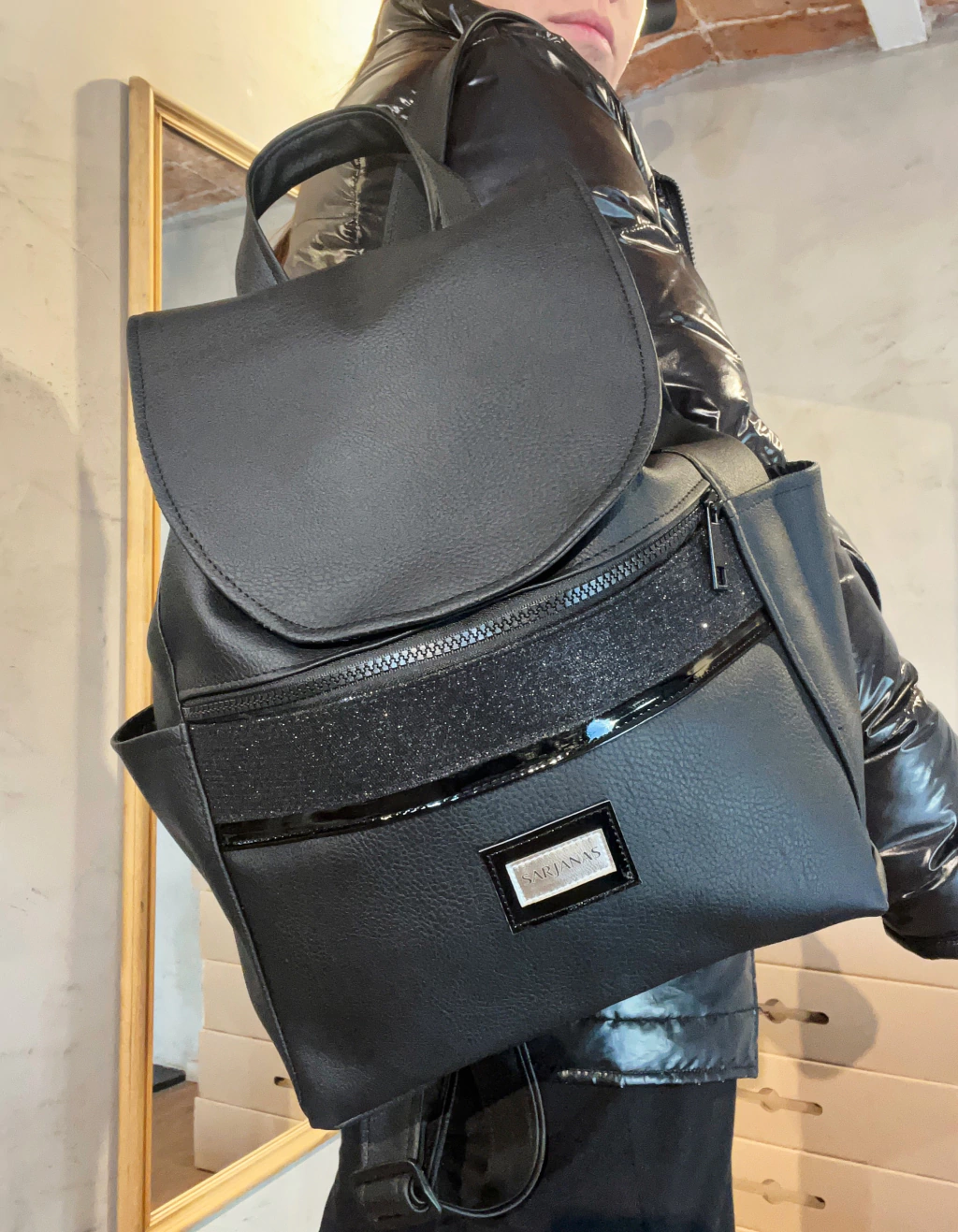 • Materiales: eco cuero negro + glitter negro + charol negro + forreria impermeable