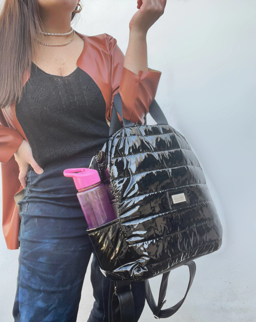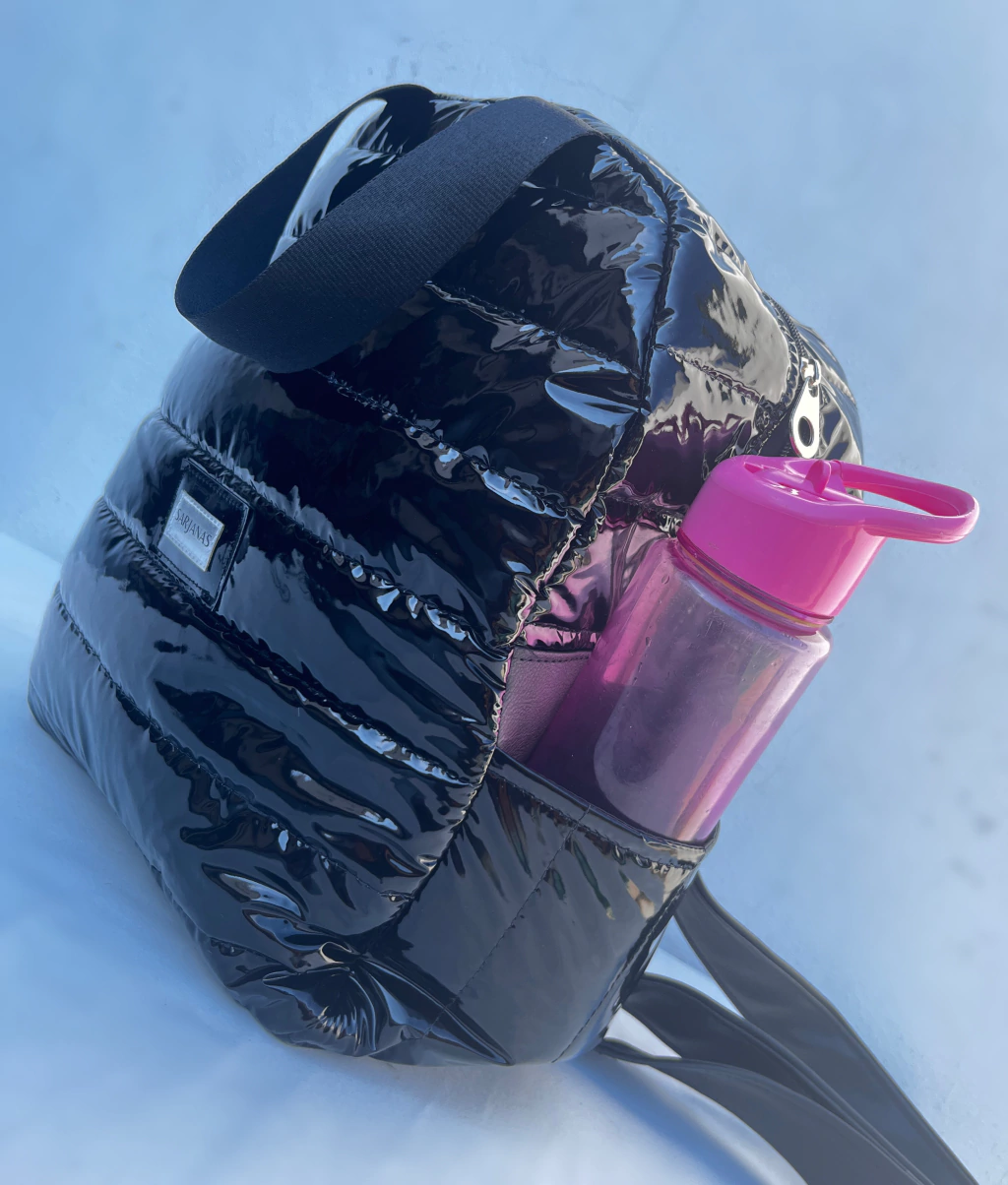 • Materiales: eco cuero negro + Matelasse negro charolado + forreria impermeable