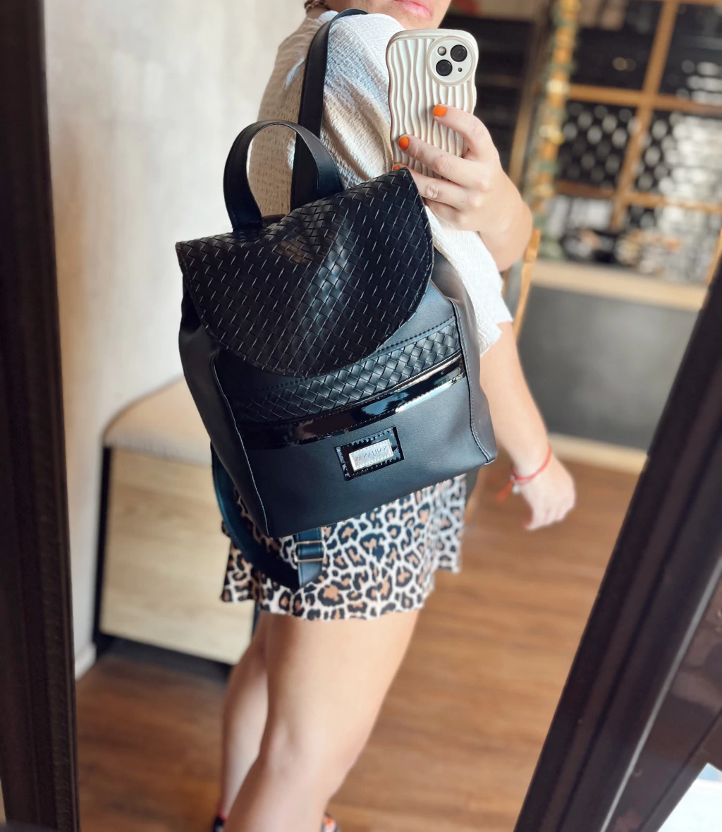 • Materiales: eco cuero negro + texturado negro + charol negro + forreria impermeable + broche imán