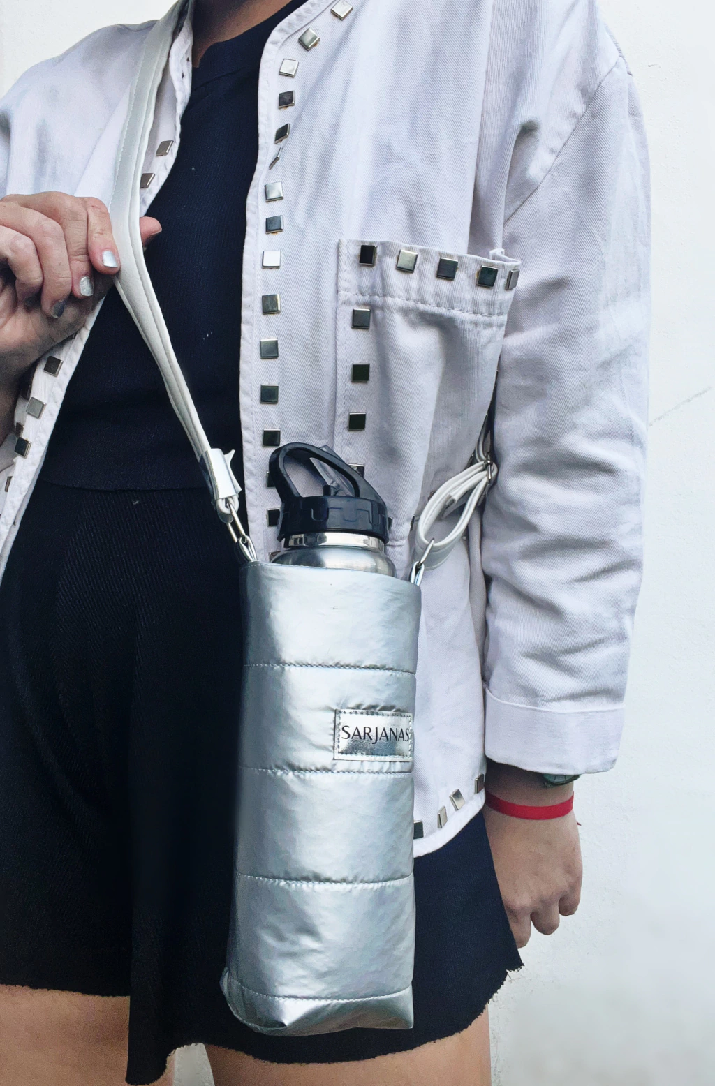 Materiales: Eco cuero blanco + matelasse plata + forreria impermeable