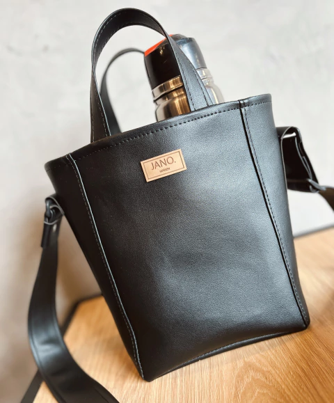 Confeccionada en eco cuero impermeable, con espacio para termo, mate, bombilla y más.